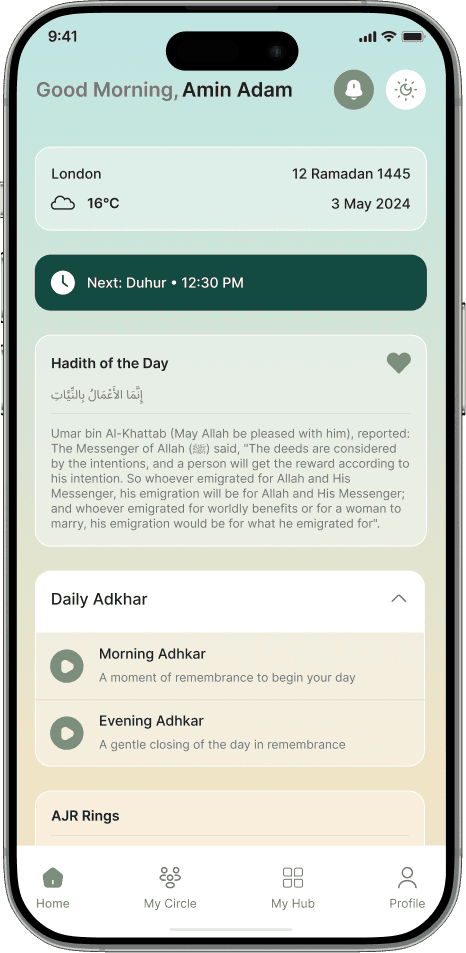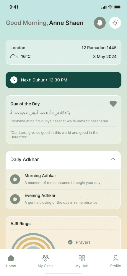 I honestly didn’t realise how much I needed an app like this. AJR feels like an all-in-one place for my Muslim daily needs. I wake up, open it straight away, check the weather, put my morning adhkar on and start my AJR rings. It’s become such an easy part of my routine.