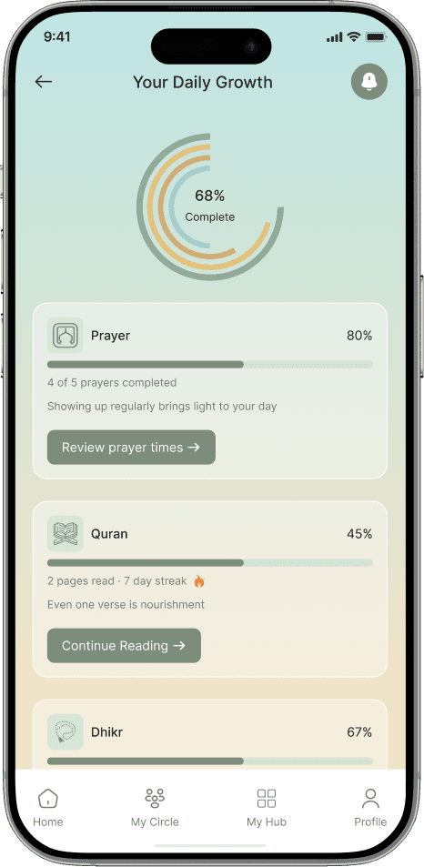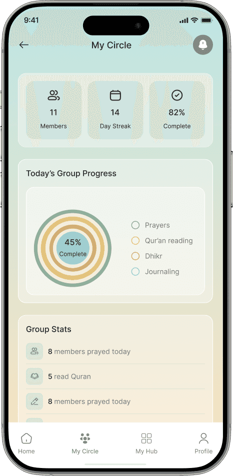 Create private circles with friends and family to stay accountable in prayer, habits, and good deeds.